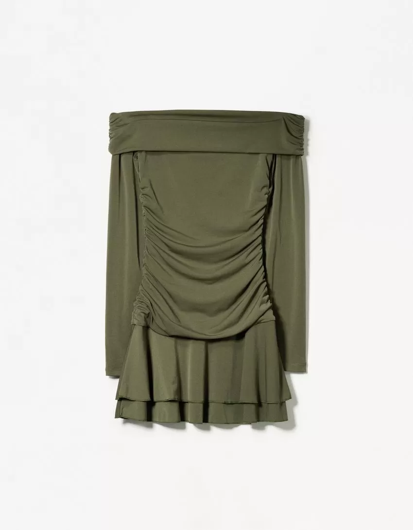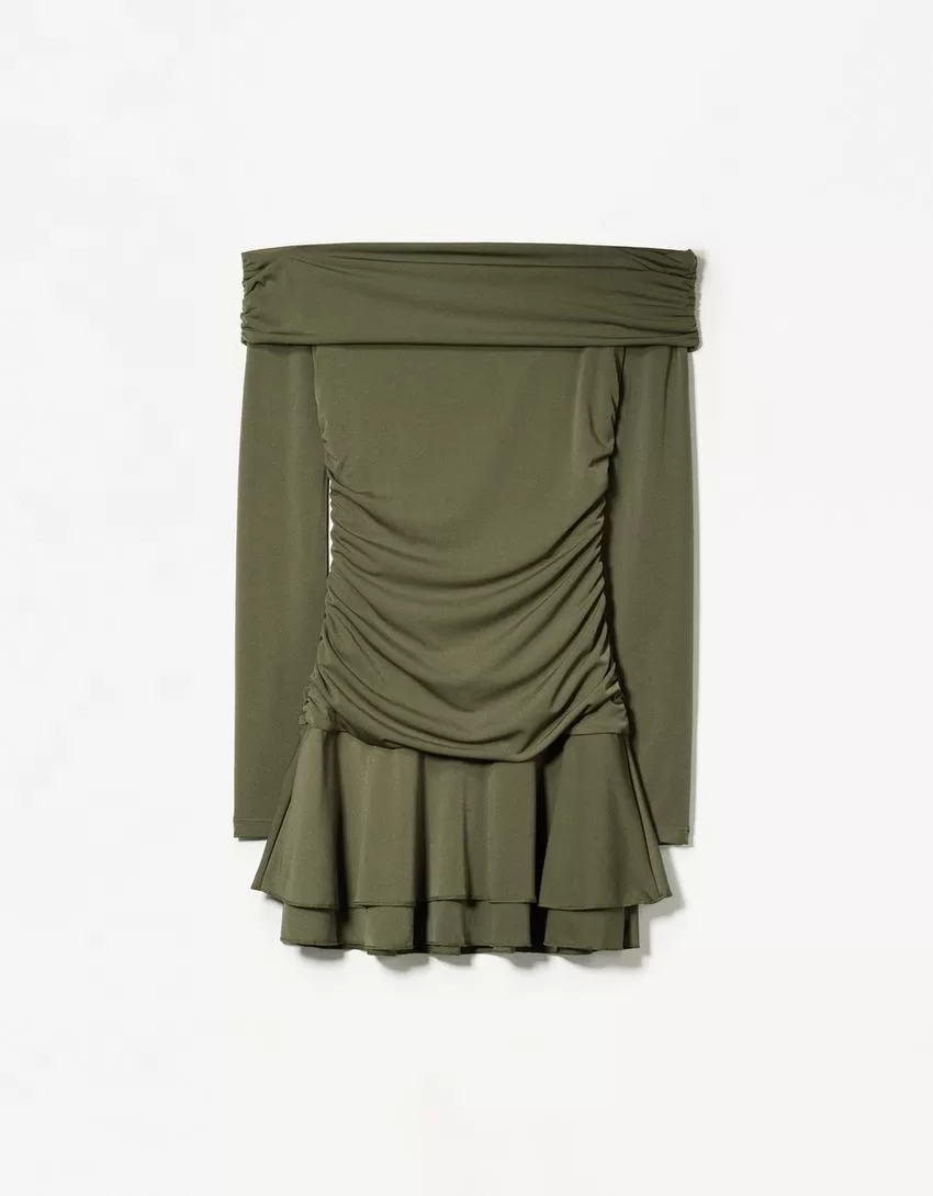 BERSHKA SERIES vestido mini con volantes y manga larga Khaki