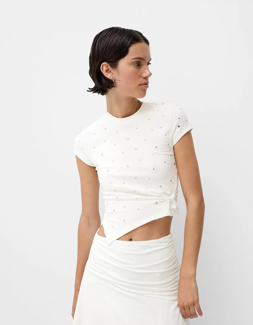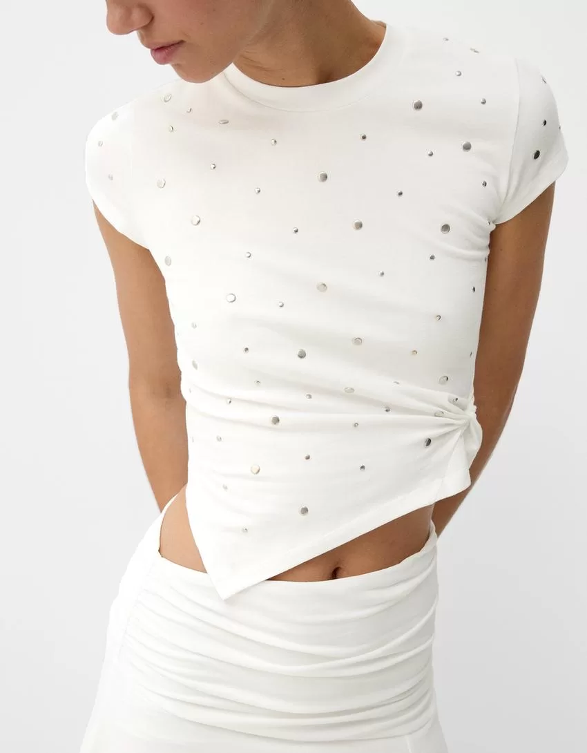 Camiseta asimétrica de manga corta con tachuelas Cream
