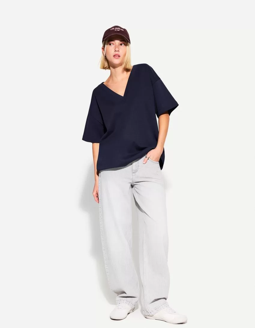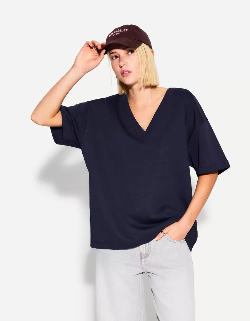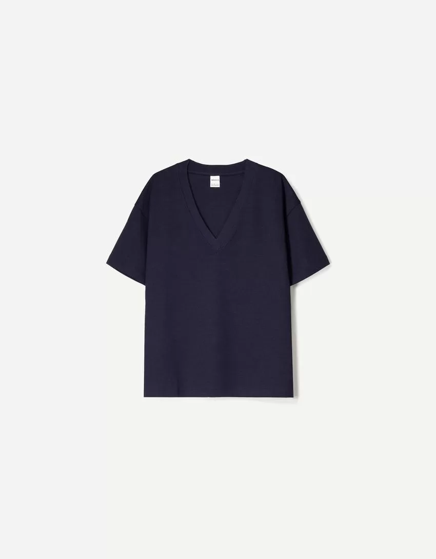 Camiseta de manga corta con cuello en V de algodón grueso Navy