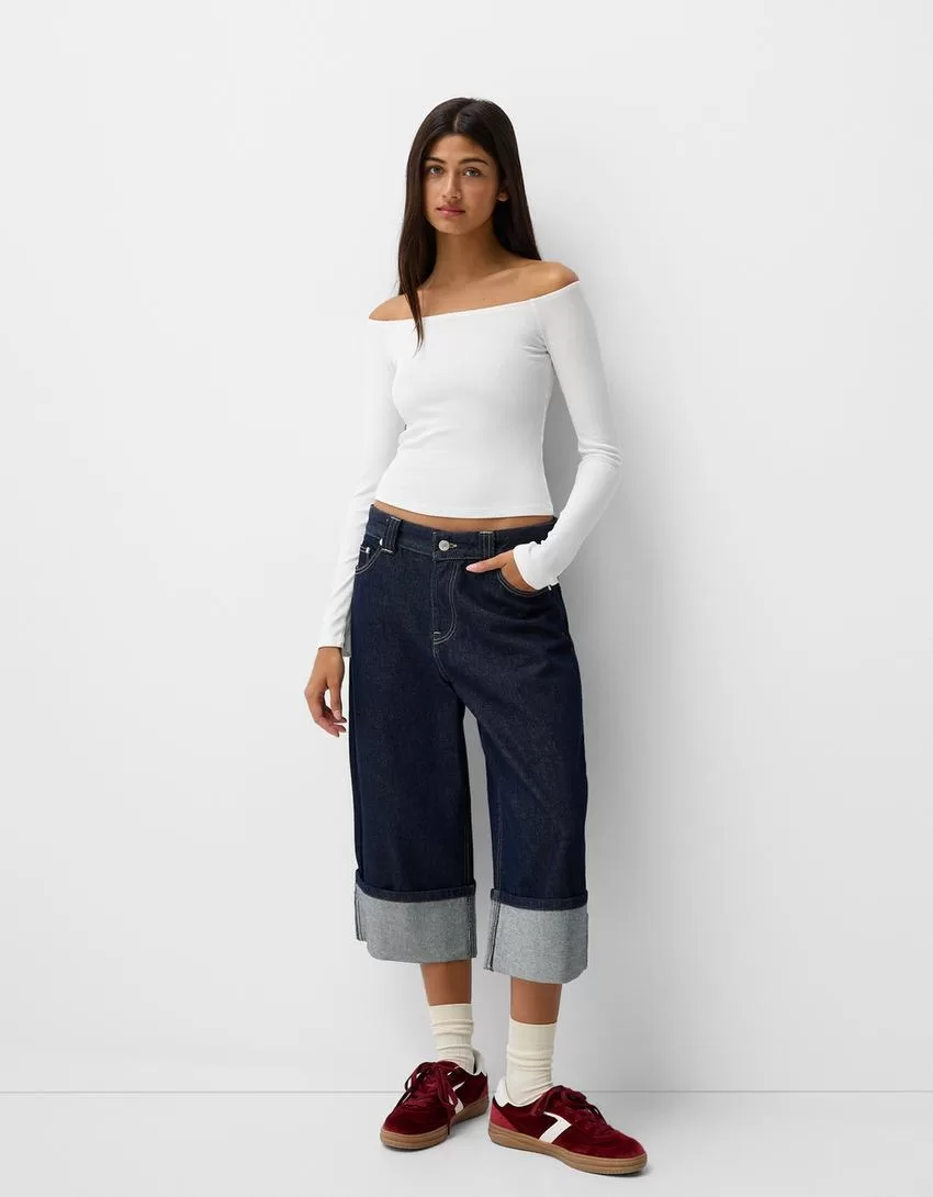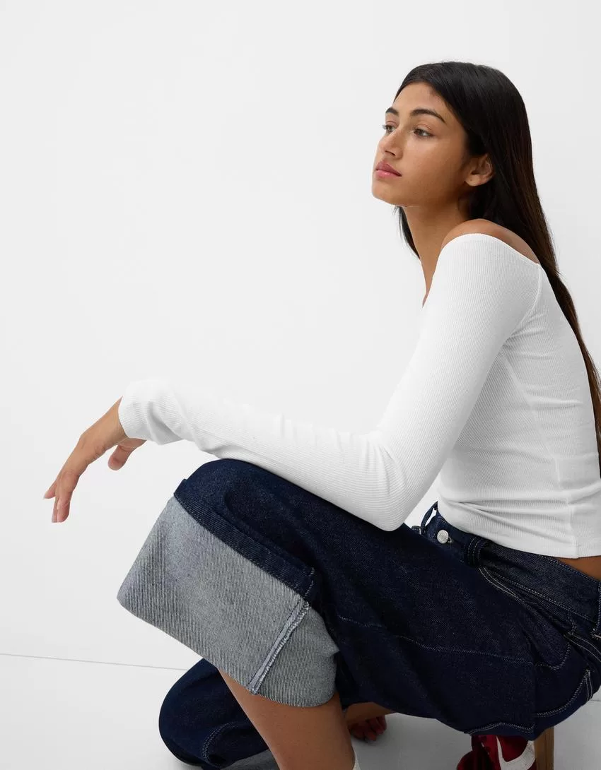 Camiseta manga larga escote Bardot Off white
