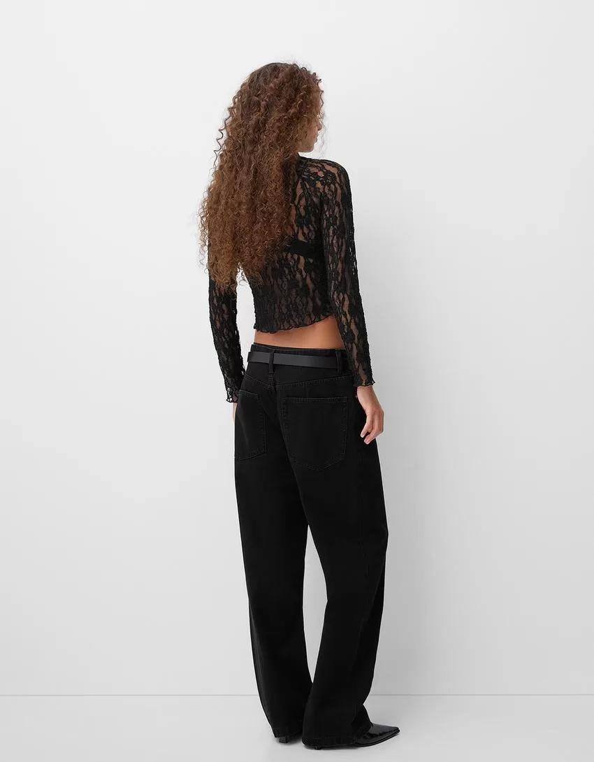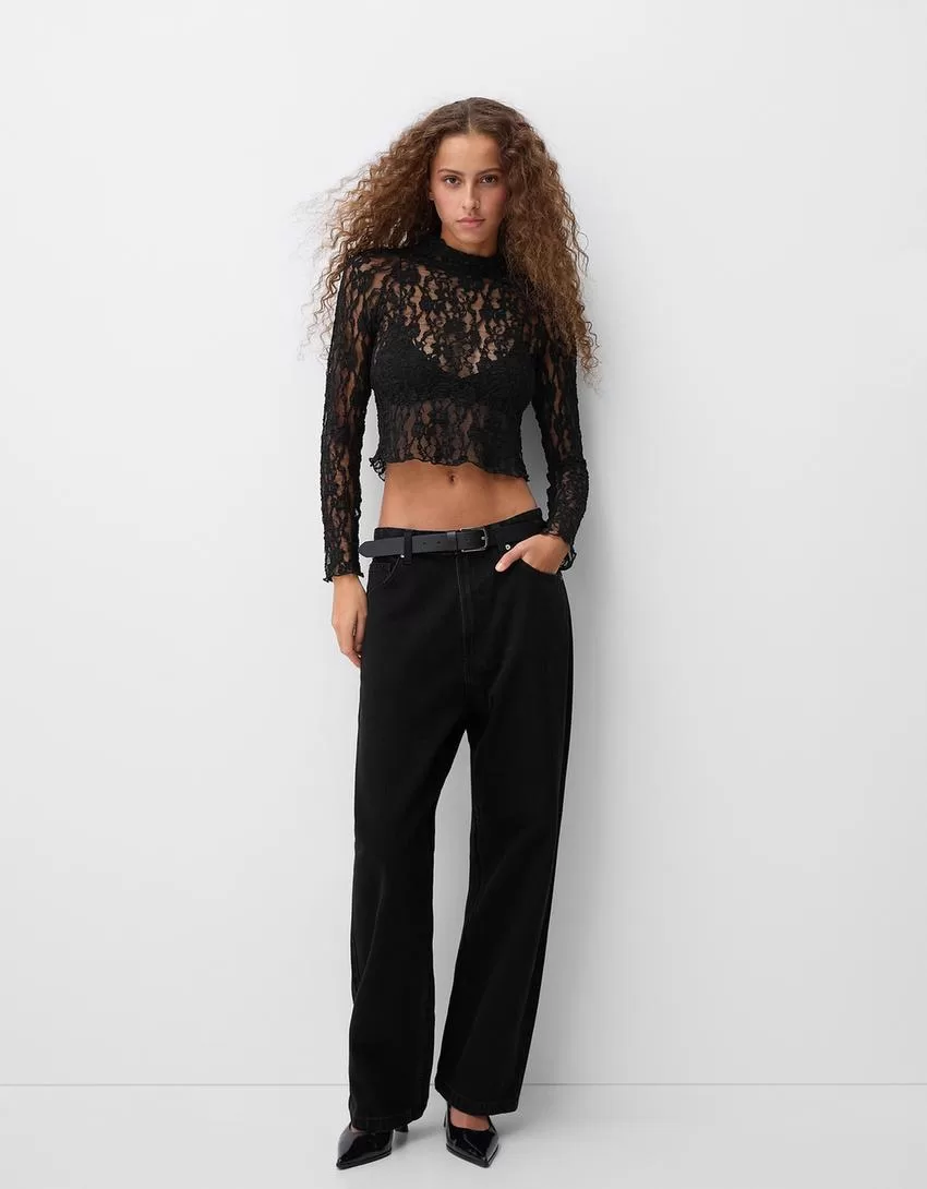Camiseta rubia de encaje con cuello alto y manga larga Black