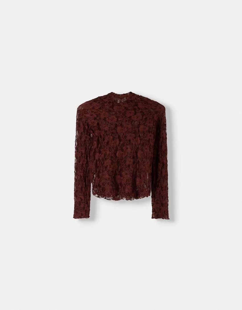 Camiseta rubia de encaje con cuello alto y manga larga Brown