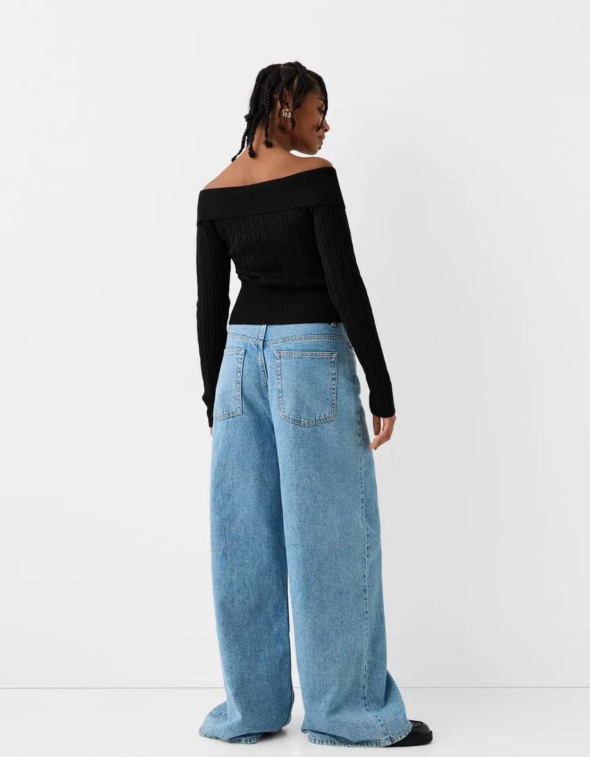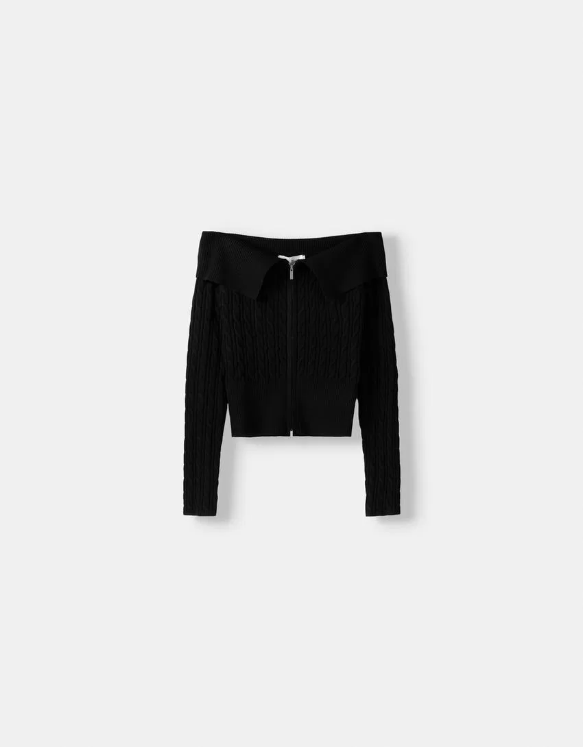 Cárdigan Bardot de punto trenzado con cremallera Black