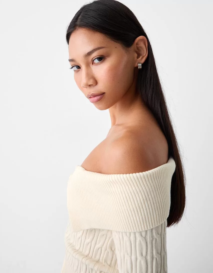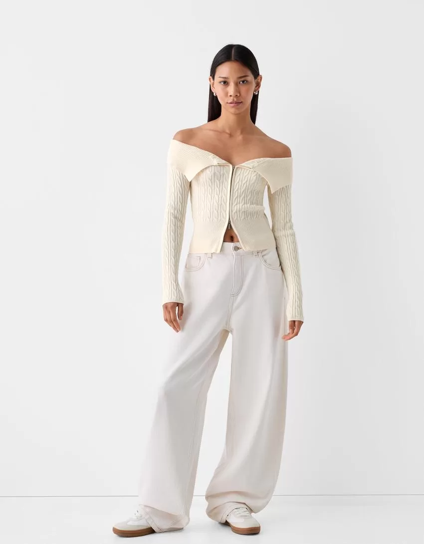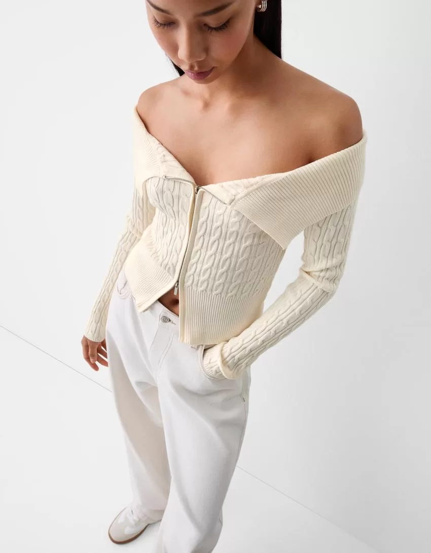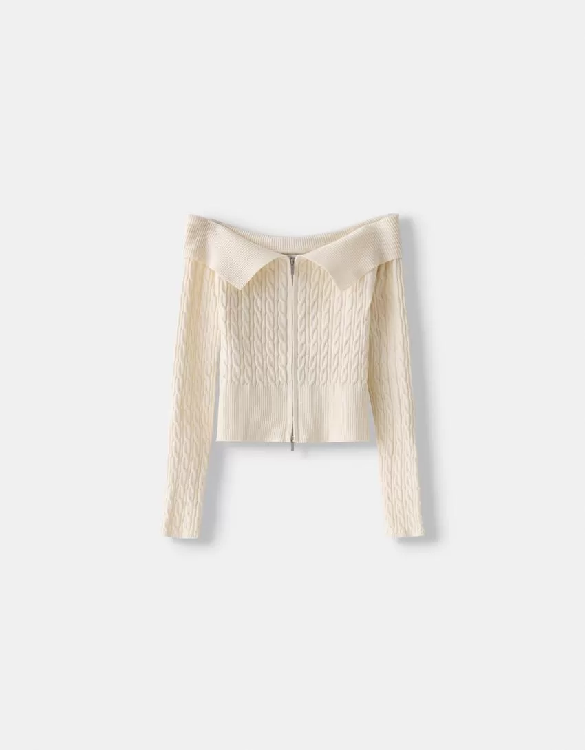 Cárdigan Bardot de punto trenzado con cremallera Cream